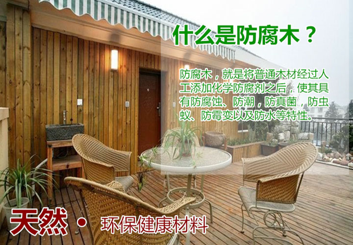防腐木材实际上是一种人工制造的木材。生产工人将普通木材注入CAA等木材防腐剂后,普通木材就变成防腐木材。但也有木材本身具有抗腐蚀性,如深炭化木材。防腐木材不仅具有防腐性,而且经久耐用,并已受到许多人的青睐。